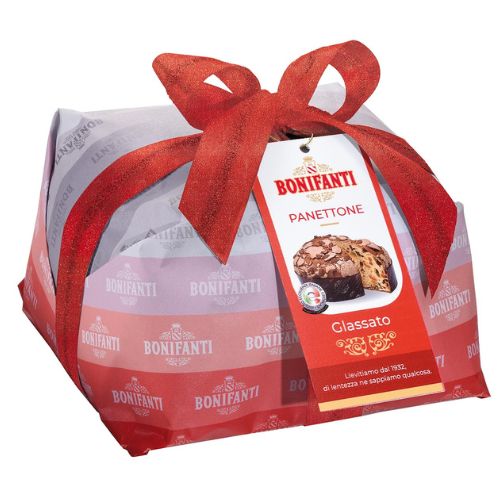 Dit is de klassieke panettone met een vulling van rozijnen en gekonfijte sinaasappel- en citroenschillen. Met bovenop een 'glassato' laag van verkruimelde hazelnoten en hele amandelen. De panettoni van Bonifanti staan bekend om het zachte en luchtige deeg.