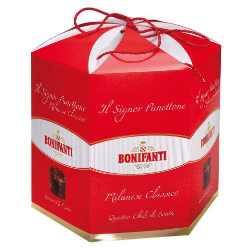 Met deze reuze panettone maak je echt indruk op de kersttafel! Deze klassieke panettone van maar liefst 4 kilo uit Milaan is zonder 'glassato' laag. In het zachte- en luchtige deeg komen de typische Bonifanti smaken en geuren samen; gemaakt met verse scharreleieren, de beste vanille, speciaal geselecteerd meel en eersteklas boter. Door het deeg zijn sultana rozijnen gemengd met zacht gekonfijte sinaasappel- en citroenschillen.